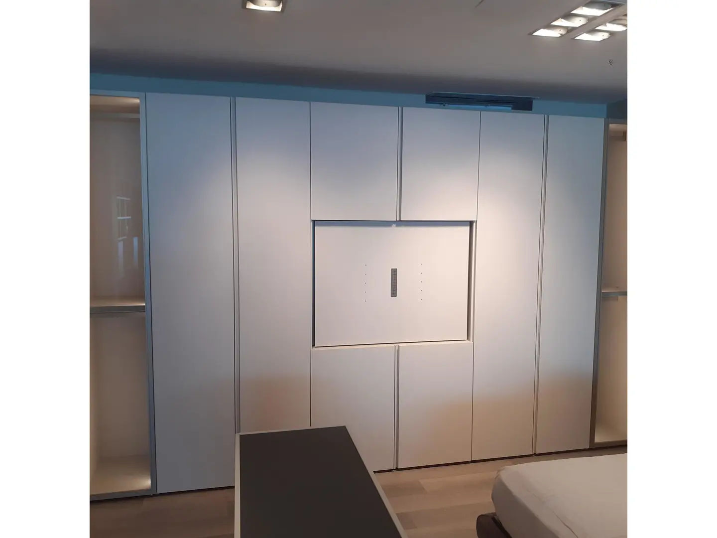 Armadio con ante a battente, dotato di elemento Odeon TV. La superficie esterna ha una finitura Sand Opaco, mentre le due ante esterne sono in vetro fumé trasparente nel design Scrigno. L’attrezzatura interna è in Metal Palladio. I fianchi sono dotati di illuminazione a led.
