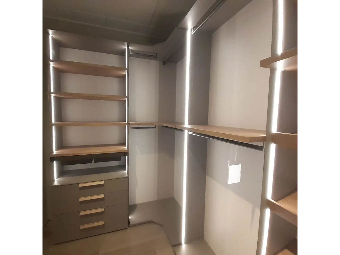 Armadio angolare a spalle. Struttura in Cachemire con illuminazione a LED integrata, ripiani per scarpe in finitura Noce Naturale 54, cassettiera con quattro cassetti, e basamenti in Cachemire.