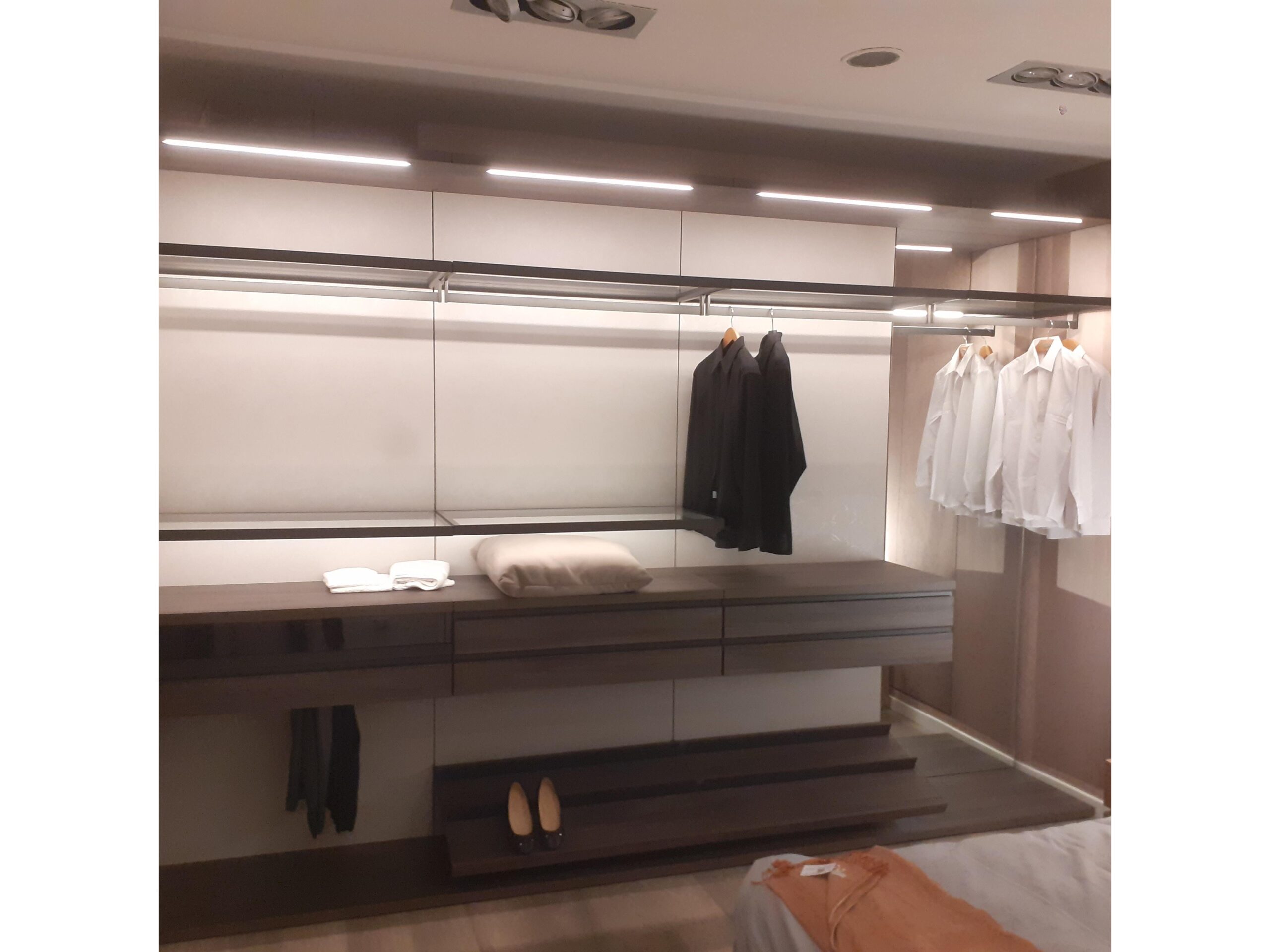 Cabina armadio con pannelli Loto Tortora, specchio riflettente argentato, cassettiere sospese e base in Olmo Materico Scuro, illuminazione a LED incassata con telecomando.
