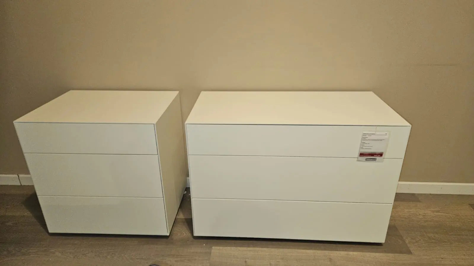 Set costituito da un comodino di dimensioni 90 cm di larghezza, 45 cm di profondità e 60 cm di altezza e un comodino più piccolo di 60 cm di larghezza, 45 cm di profondità e 60 cm di altezza, entrambi verniciati in bianco opaco. La lampada non è compresa nel prezzo.