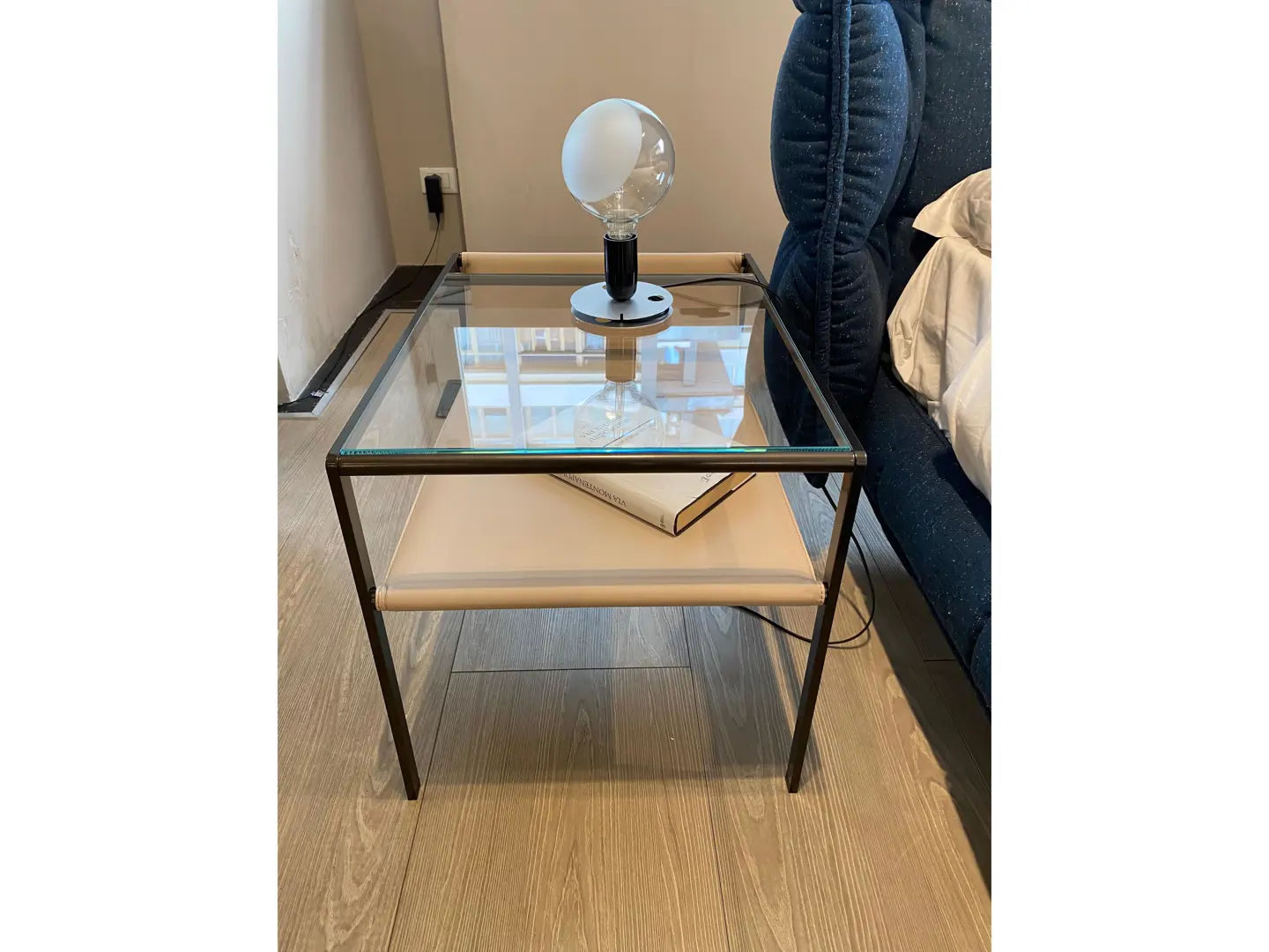 QUIET LINES Set di 2 raffinati comodini dal design accattivante. Fanno parte della collezione con lo stesso nome e possono essere utilizzati da entrambi i lati; sono contraddistinti da un ripiano in pelle e un top in vetro che creano un effetto vetrina.