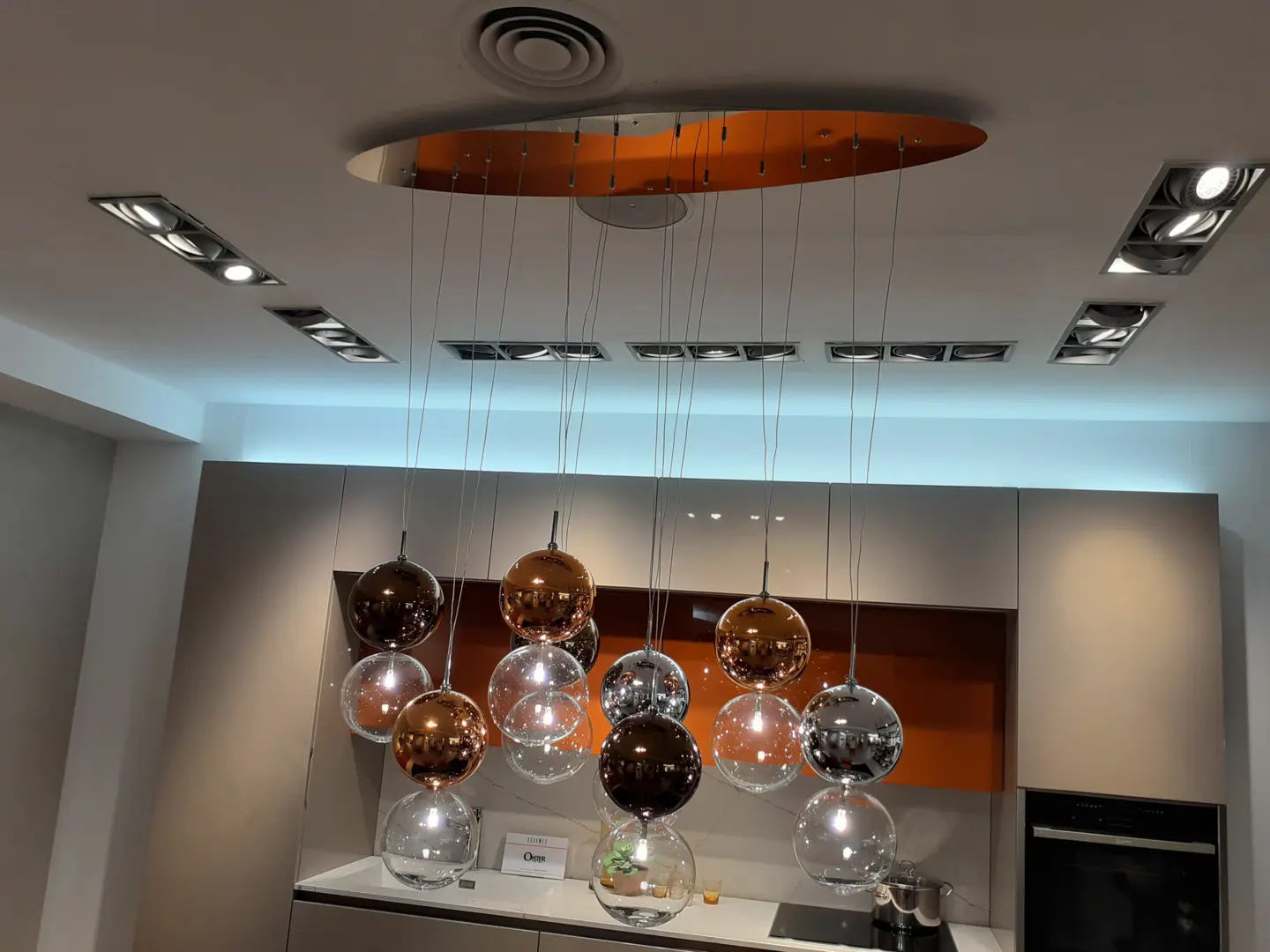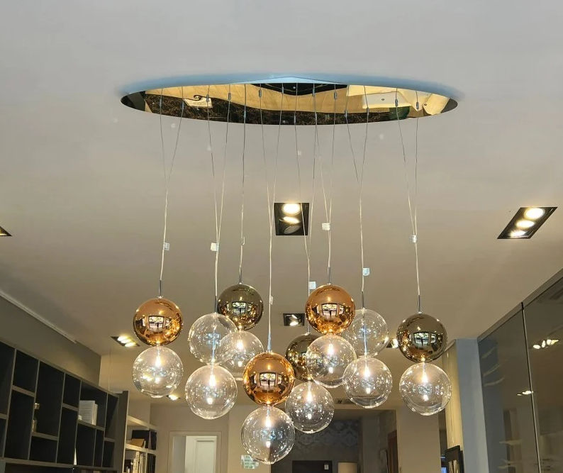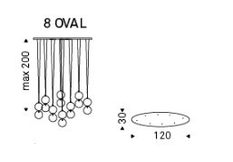Lampadario a sospensione dotato di attacco ovale per 8 paralumi in inox. N.3 Rame, N.3 Bronzo, N.2 Cromo