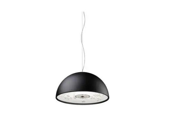 Lampada da soffitto con luminosità diffusa. Struttura in gesso bianco all’interno e finiture esterne in nero lucido. Diffusore in vetro opalino soffiato a mano. Decorazione in acciaio inox fotoinciso e modellato. Diam. 40