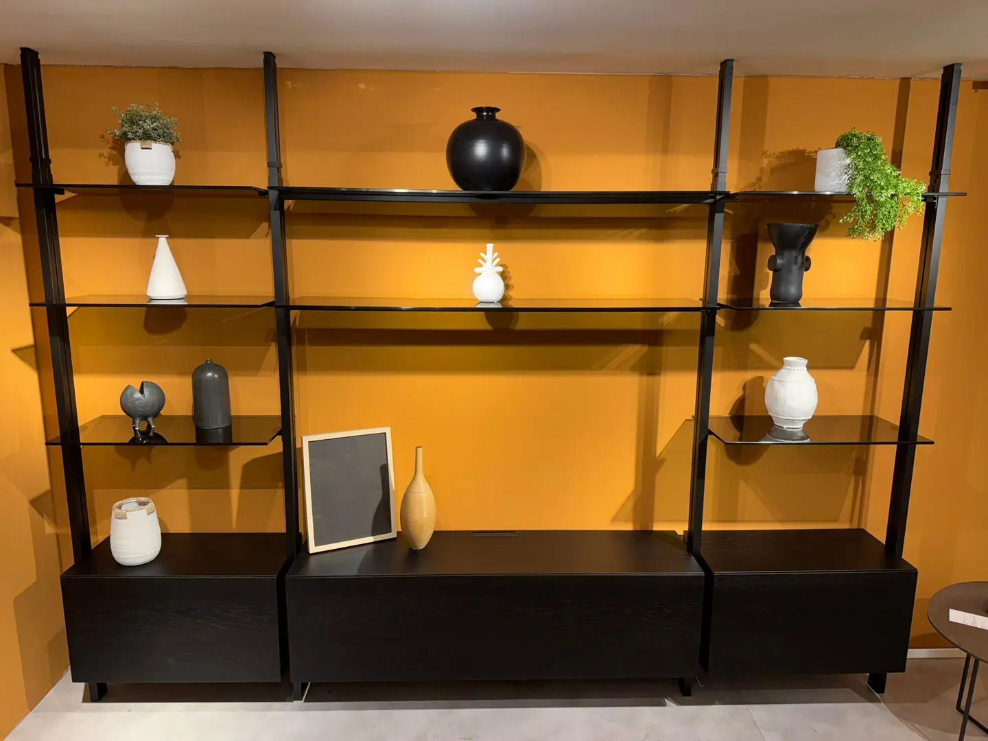 La libreria System rappresenta un innovativo sistema modulare brevettato chiamato EXTENDO, composto da due profili in alluminio da soffitto, estensibili e progettati per adattarsi a varie altezze degli ambienti. Utilizzando la leva a scomparsa, i profili possono essere fissati all’altezza preferita. La finitura è in alluminio C08 nero, con ripiani in vetro fumé e contenitori con anta a ribalta in Rovere nero Y38.
