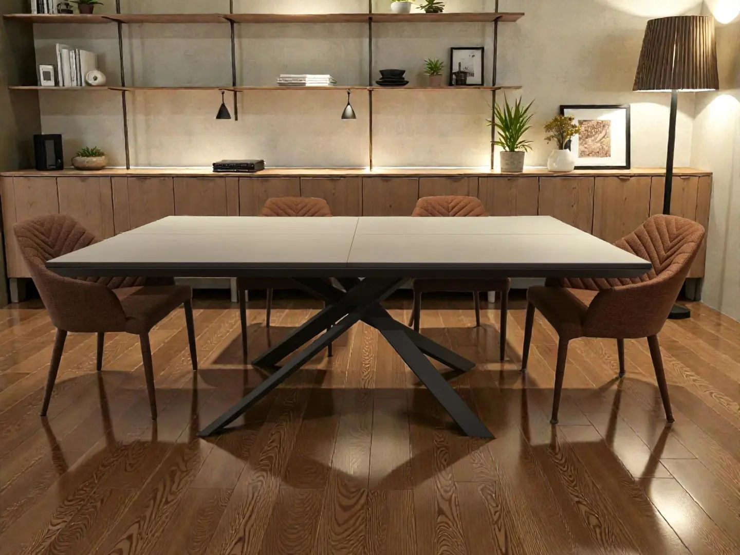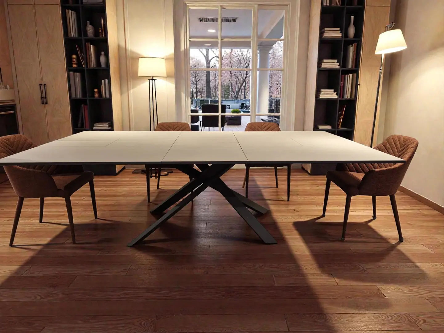 Tavolo dotato di un innovativo sistema di apertura, capace di espandersi sia in larghezza che in lunghezza. La struttura è finita in Bronzo MT97. Il piano è composto da Ceramica Luce CC15, materiale utilizzato anche per le allunghe.