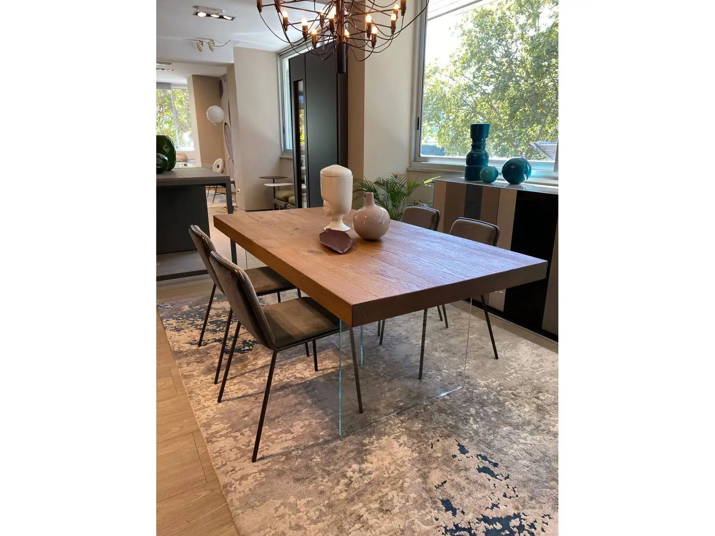 Le prolunghe sono custodite all’interno. È fornito di 3 gambe in vetro extrachiaro. dimensioni l.190/294X85 H.76