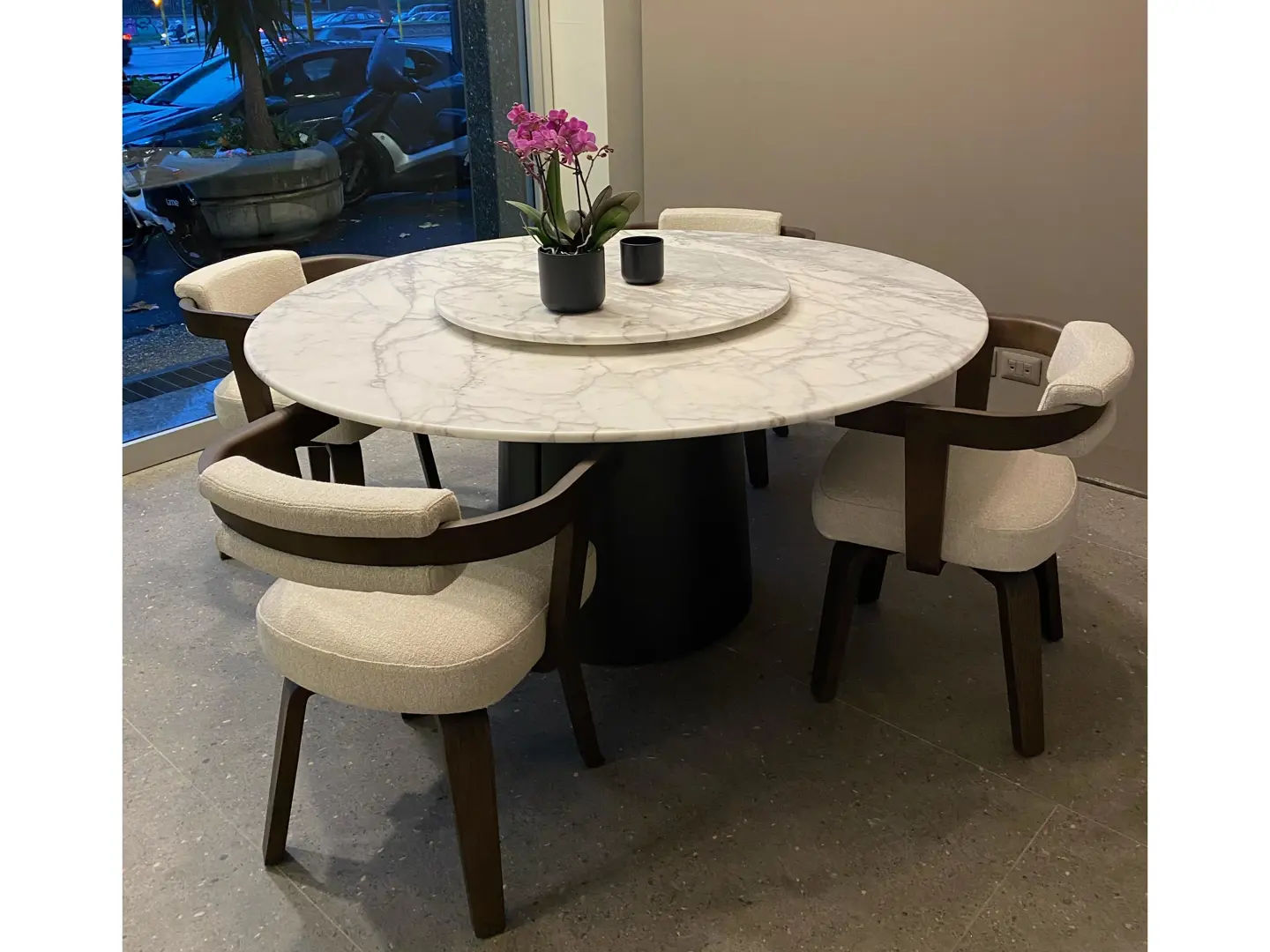 Set composto da tavolo Mateo e 4 sedie Porta Volta. Il tavolo Mateo di Molteni conferisce un tocco di eleganza a qualsiasi ambiente. La base centrale in metallo brunito, dalla forma cilindrica, è composta da due parti stampate che, unite, danno vita a una fuga aperta che ne accentua la leggerezza. Il piano è in marmo Calacatta Opaco e dispone di un piatto girevole al centro. Dimensioni: Diam. 160 h. 74. La sedia Porta Volta mette in risalto la connessione tra la seduta imbottita e lo schienale rigido. Per un comfort ottimale, la sedia è dotata di un’imbottitura rettangolare, più generosa nello schienale. La struttura è in frassino tinto eucalipto, con seduta e schienale rivestiti in cat. Zi410 Zago.