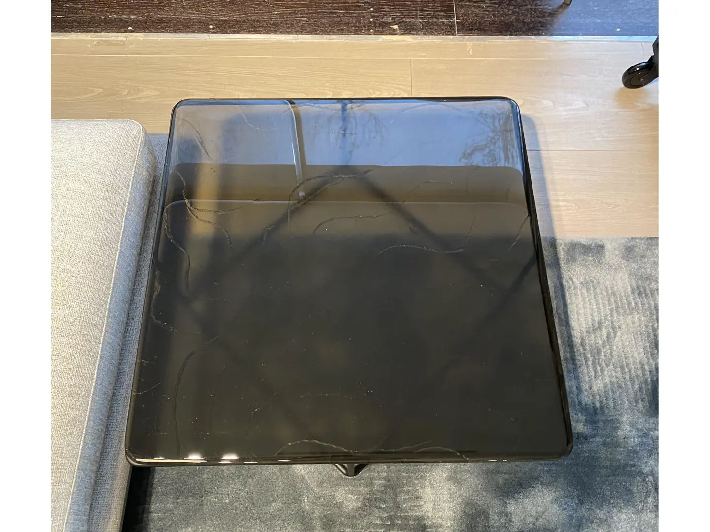 Tavolino da caffè caratterizzato da evidenti tratti stilistici. Struttura verniciata di nero opaco, piano in vetro fuso di colore ambra, dimensioni L.80 P.80 H.32